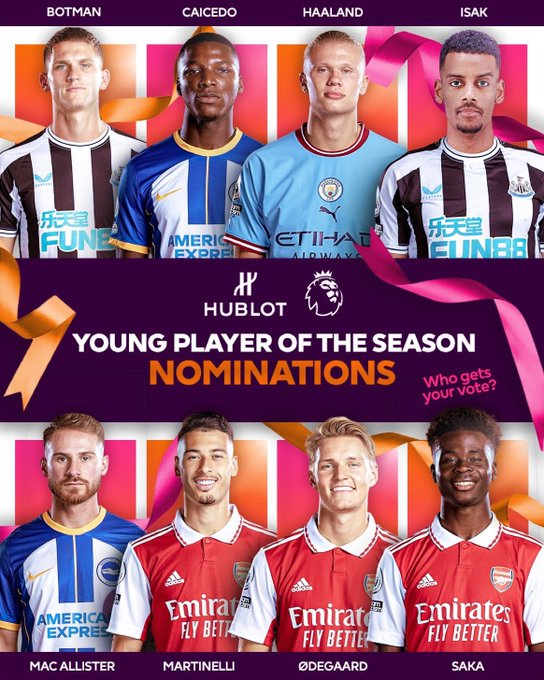 كشفت رابطة بطولة الدوري الإنجليزي عبر موقعه الرسمي، عن قائمة اللاعبين المرشحين لحصد جائزة أفضل لاعب شاب في بطولة الدوري الإنجليزي "البريميرليج" للموسم الجاري 2022-2023.