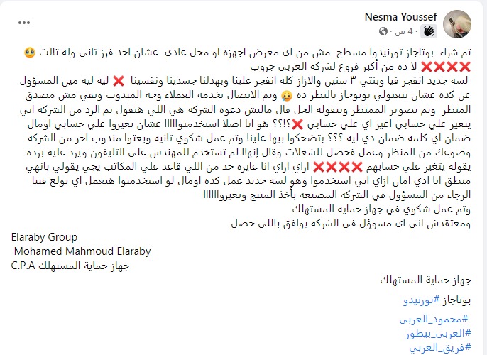 حذر عدد من المواطنين من شركة العربي جروب بعد توثيق تجاربهم مع الشركة ومنتجاتها وسوء الخدمة المقدمة، وقالت إحدي السيدات ،" تم شراء بوتاجاز تورنيدوا مسطح مش من اي معرض اجهزه او محل عادي عشان اخد فرز تاني وله تالت لا ده من أكبر فروع لشركه العربي جروب لسه جديد انفجر فيا وبنتي ٣ سنين والازاز كله انفجر علينا وبهدلنا جسدينا ونفسينا ليه ليه مين المسؤول عن كده عشان تبعتولي بوتوجاز بالنظر وتم الاتصال بخدمه العملاء وجه المندوب وبقي مش مصدق المنظر وتم تصوير الممنظر وبنقوله الحل قال ماليش دعوه الشركه هي اللي هتقول تم الرد من الشركه اني يتغير علي حسابي اغير اي علي حسابي ❌؟!؟؟ ".