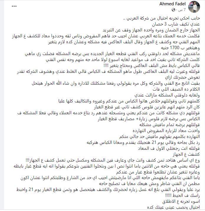 ومن جانبه قال مواطن آخر عن مشكلته مع العربي،" حابب احكي تجربه احتيال من شركة العربي ..عندي تكيف شارب 3 حصان الجهاز خارج الضمان ومره واحده الجهاز وقف عن التبريد فكلمت خدمه العملاء بتاعه العربي عشان اجيب حد فاهم المفروض وناس ثقه وحددوا معاد للكشف ع الجهاز المهم الفني جه وكشف ع الجهاز وقال البلف العاكس فيه مشكله وعشان كده لازم يتغير وهيتغير ب 1700 جنيه ماعنديش مشكله لحد دلوقتي ركب الفني قطعه الغيار الجديده بس برضه المشكله فضلت زي ماهي كلمت الشركه تاني بقيت اخد ف مواعيد لغايه اسبوع لولا ماحد جه منهم وجه نفس الفني "