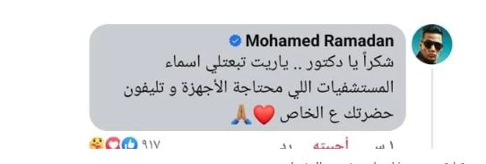 وكتب محمد رمضان تعليقا على منشور جمال شعبان، عبر حسابه الرسمي على موقع التواصل الاجتماعي فيس بوك قائلا:" شكرا يا دكتور.. ياريت تبعتلي أسماء المستشفيات اللي محتاجة الأجهزة، وتليفون حضرتك على الخاص".