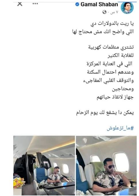 كتب جمال شعبان: "يا ريت بالدولارات دي..اللي واضح انك مش محتاج لها ..تشتري منظمات كهربية للغلابة الكتير اللي في العناية المركزة وعندهم احتمال السكتة والتوقف القلبي المفاجئ، ومحتاجين جهاز لإنقاذ حياتهم يمكن دا يشفع لك يوم الزحام".
