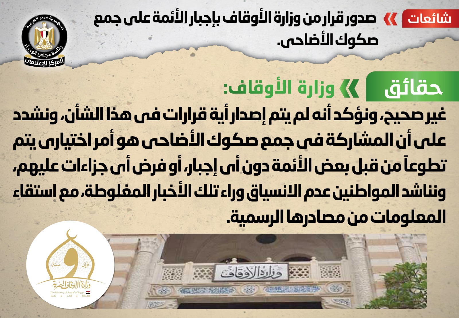 قام المركز الإعلامي لمجلس الوزراء بالتواصل مع وزارة الأوقاف، والتي نفت تلك الأنباء، مؤكدةً أنه لا صحة لإجبار الوزارة الأئمة على جمع صكوك الأضاحي، وأنه لم يتم إصدار أية قرارات في هذا الشأن، مُشددةً على أن المشاركة في جمع صكوك الأضاحي هو أمر اختياري يتم تطوعاً من قبل بعض الأئمة دون أي إجبار، أو فرض أي جزاءات عليهم، مُناشدةً المواطنين عدم الانسياق وراء تلك الأخبار المغلوطة، مع استقاء المعلومات من مصادرها الرسمية.
