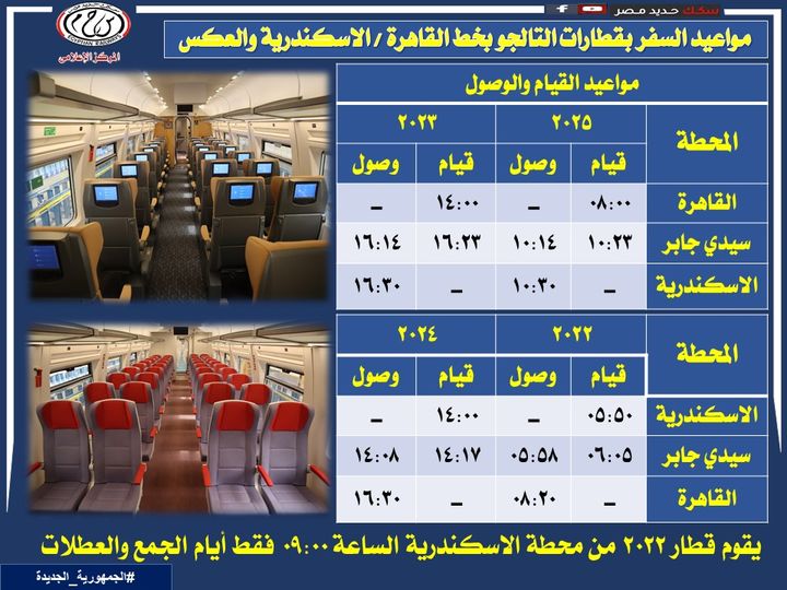 كما قررت الهيئة قيام قطار 2022 "الأسكندرية - القاهرة " من محطة الاسكندرية الساعة 9.00 صباحاً فقط أيام الجمع والعطلات وباقي أيام الاسبوع يتم قيامة بجدوله الحالي .