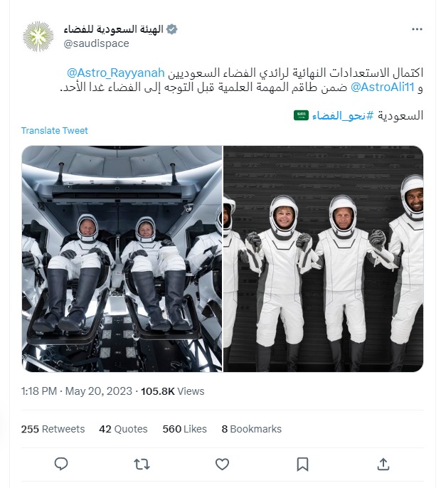 وجاء في تغريدة الهيئة السعودية للفضاء على "تويتر"، صورتان وتعليق جاء به: "اكتمال الاستعدادات النهائية لرائدي الفضاء السعوديين، ضمن طاقم المهمة العلمية، قبل التوجه إلى الفضاء غدا الأحد".