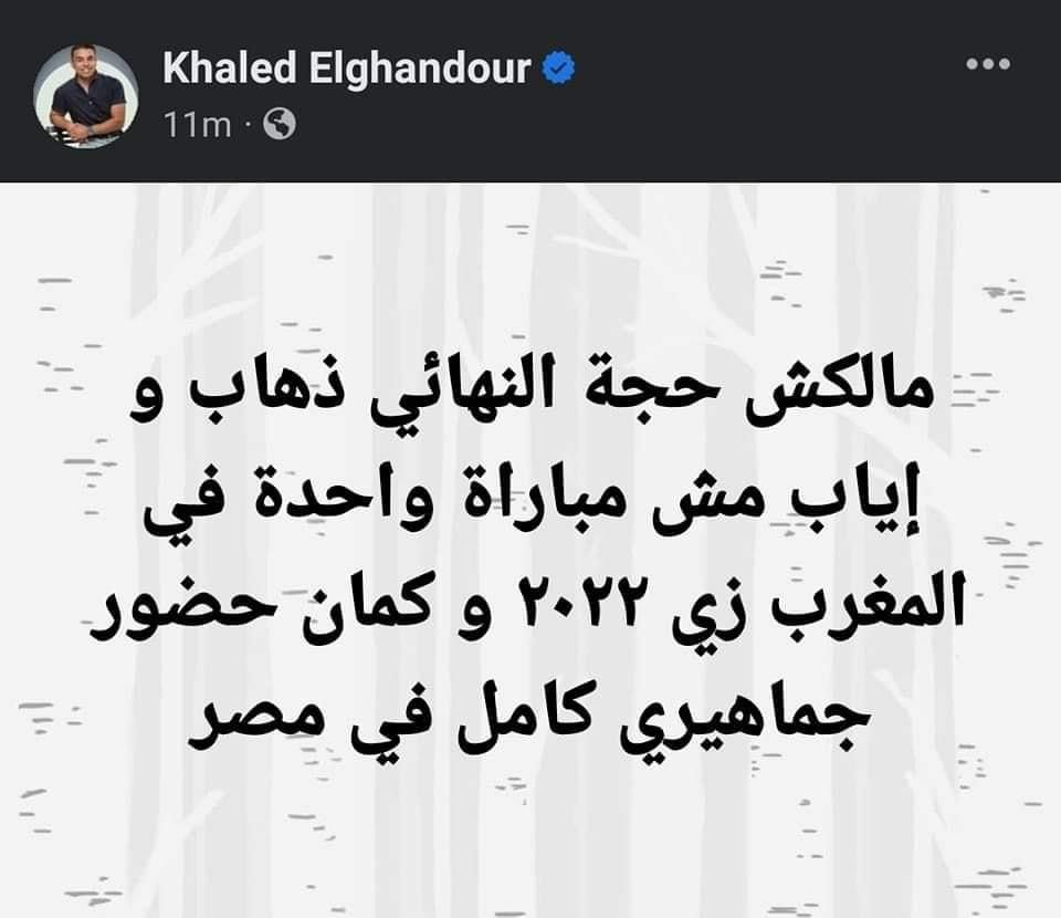 وكتب الغندور عبر حسابه الشخصي على موقع التواصل الاجتماعى "فيس بوك":"مالكش حجة النهائي ذهاب و إياب مش مباراة واحدة في المغرب زي ٢٠٢٢ و كمان حضور جماهيري كامل في مصر".