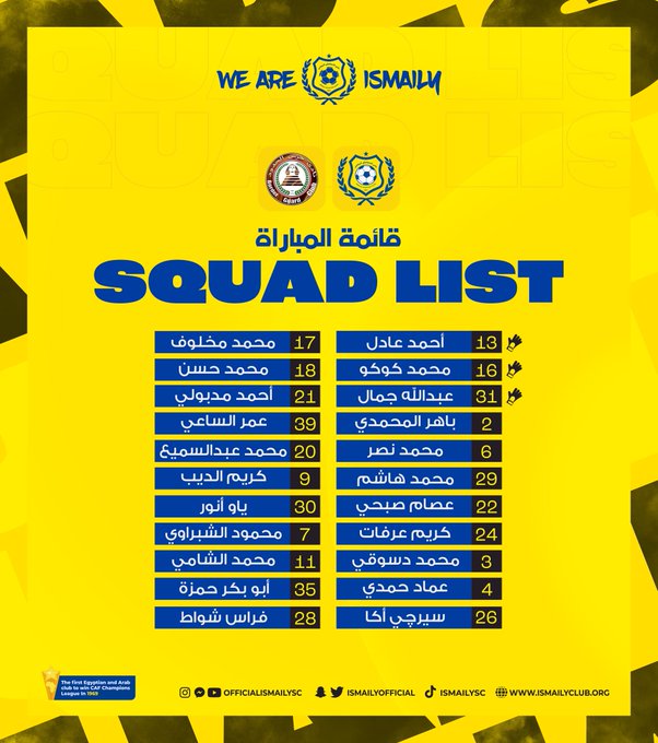 قائمة الإسماعيلي لمواجهة حرس الحدود في الدوري المصري