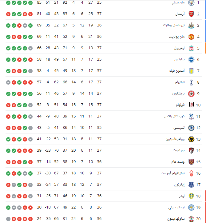 وجاء جدول ترتيب الدوري الإنجليزي على النحو التالي: