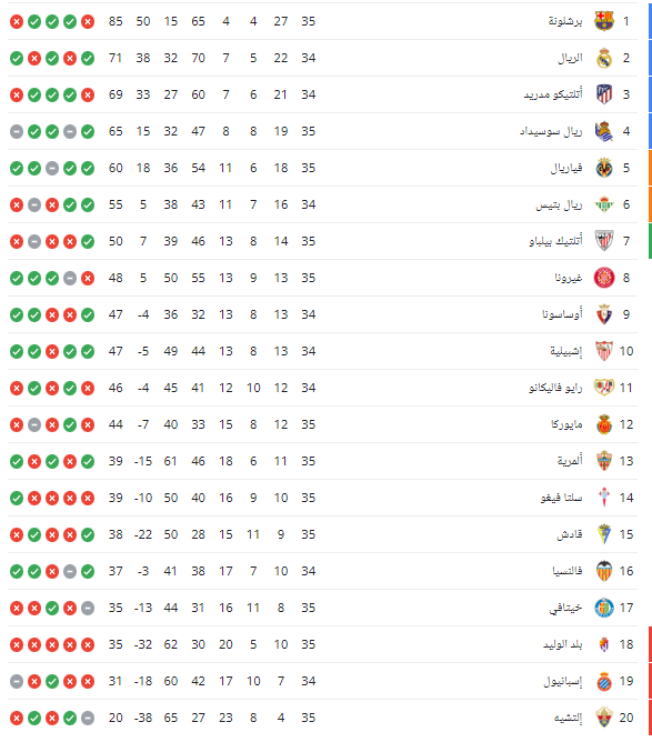 ويحتل فريق برشلونة صدارة الدوري الإسباني فيما يتواجد ريال مدريد في المركز الثاني، وجا جدول ترتيب الدوري الإسباني كالاتي: