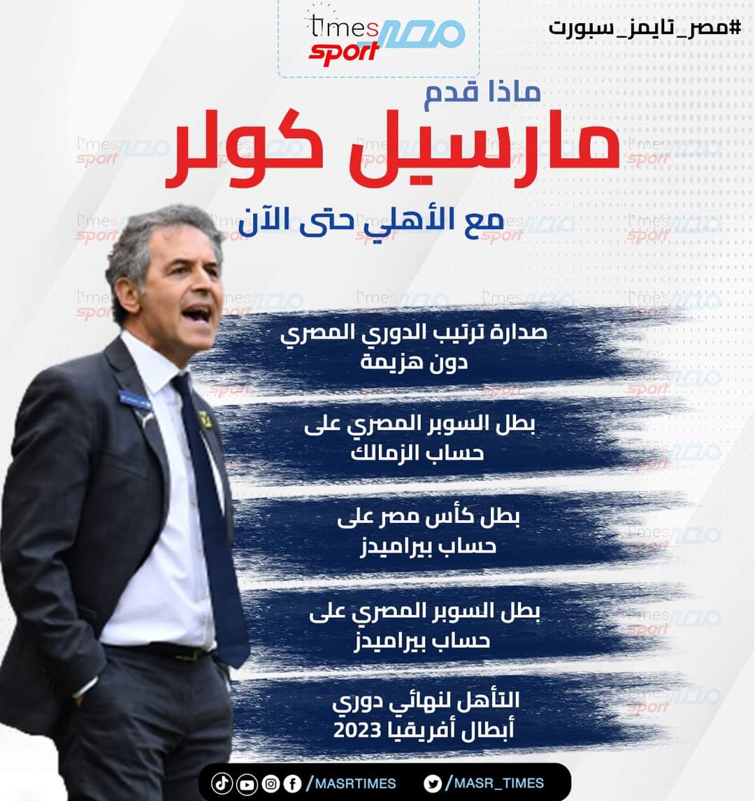 ويتصدر النادي الأهلي تحت قيادة مارسيل كولر جدول ترتيب الدوري المصري الممتاز للموسم الجاري دون الهزيمة، وحصل على السوبر المصري على حساب غريمة التقليدي فريق الزمالك، إلى جانب التتويج بلقب كأس مصر على حساب بيراميدز، وبطل السوبر المصري على حساب بيراميدز، وقاد كولر الفريق للتأهل لإلى نهائي دوري أبطال أفريقيا 2023.