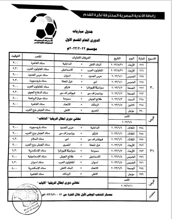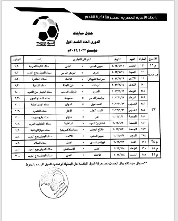 كما جرى تعديل موعد مباراة فاركو وسموحة، المقرر إقامتها الثلاثاء المقبل، لتقام فى التاسعة والنصف مساءً بدلاً من السابعة مساءً.