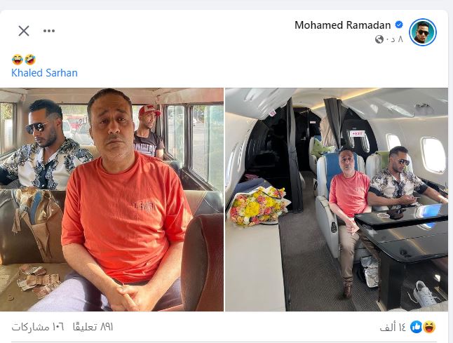 لم يكتف رمضان بالصورة الأولي، ولكنه دمج صورته وبجواره الدولارات، وجالس خلفه الفنان خالد سرحان داخل طيارته الخاصة، :كأنها أشارة لعزومة سرحان من أجل عد الدولارات، كسخرية بشكل آخر.