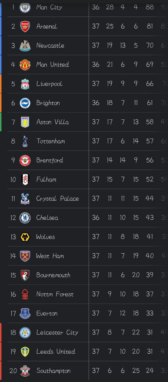 ترتيب الدوري الانجليزي..و ضمن نادي نيوكاسل يونايتد التأهل لدوري أبطال أوروبا للموسم القادم بعد غياب دام 20 عاماً منذ أن شارك في بطولة 2002-2023.