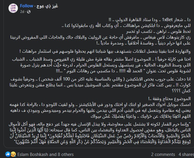 وقال منشوره: "1xBet ودا ستاد القاهرة الدولي اللي مايعرفوش دا ابلكيشن مراهنااات تحط فلوس تراهن، تكسب او تخسر زي كازينوهات لاس فيغاس مافرقش أي حاجة عن الروليت والبلاك جاك والحاجات اللي المفروض اتربينا على انها حرام دينياً .. وفاسدة أخلاقياً .. ومدمرة مادياً.