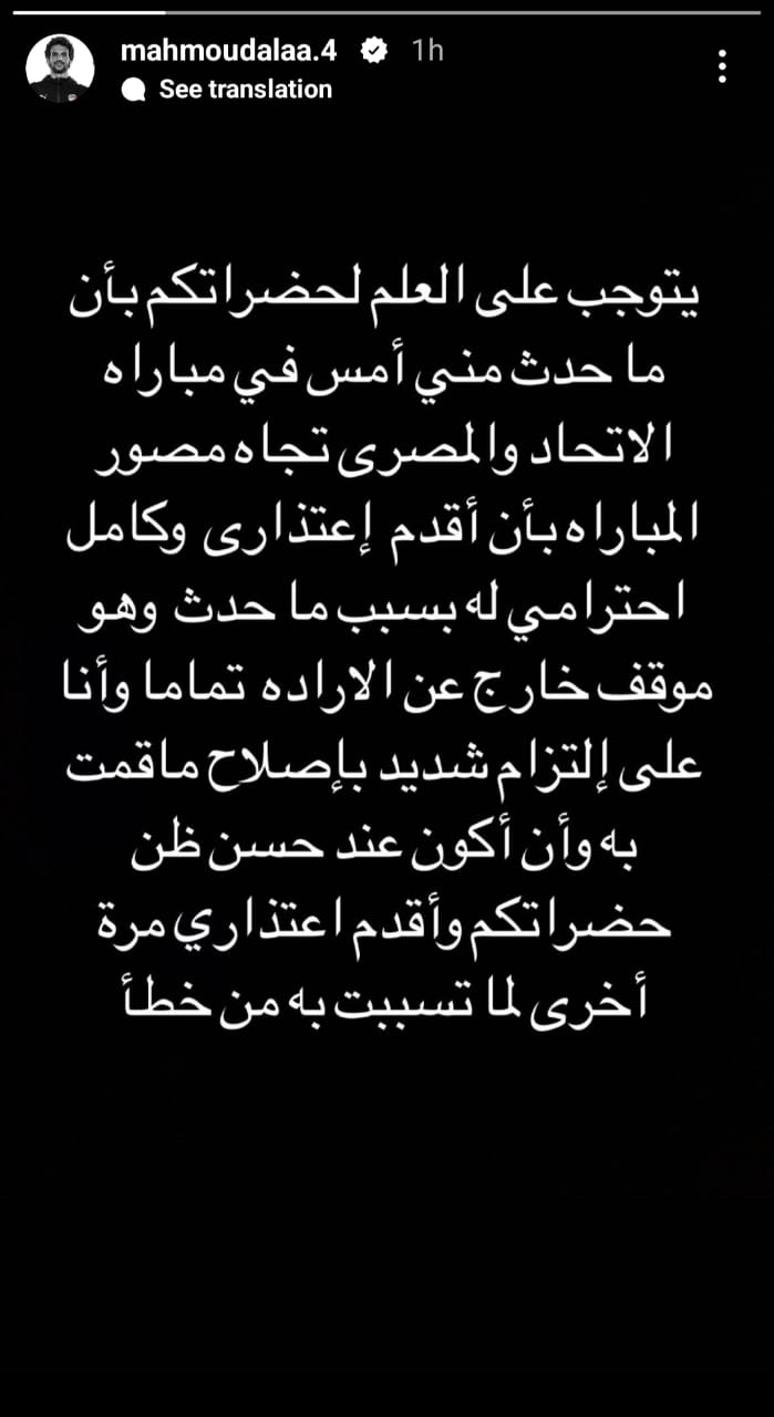 محمود علاء يعتذر عن "الواقعة المشينة" في مباراة الاتحاد والمصري