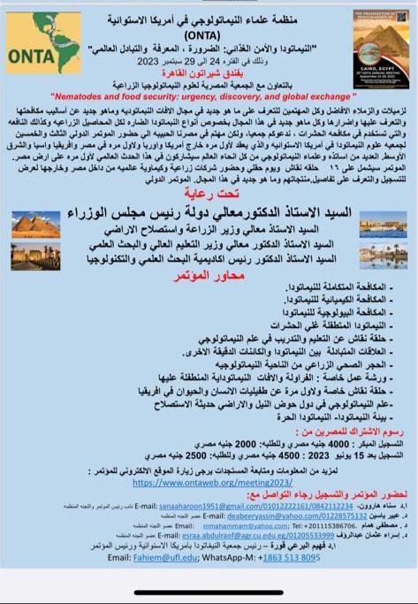تحت رعاية د مصطفى مدبولي رئيس مجلس الوزراء والسيد القصير وزير الزراعة واستصلاح الأراضي والدكتور أيمن عاشور وزير التعليم العالي والبحث العلمي تستضيف القاهرة المؤتمر الدولى ال 53 للنيماتودا ويقول د فهيم قورة رئيس الموتمر ورئيس جمعية النيماتولوجي في أمريكا الاستوائية.