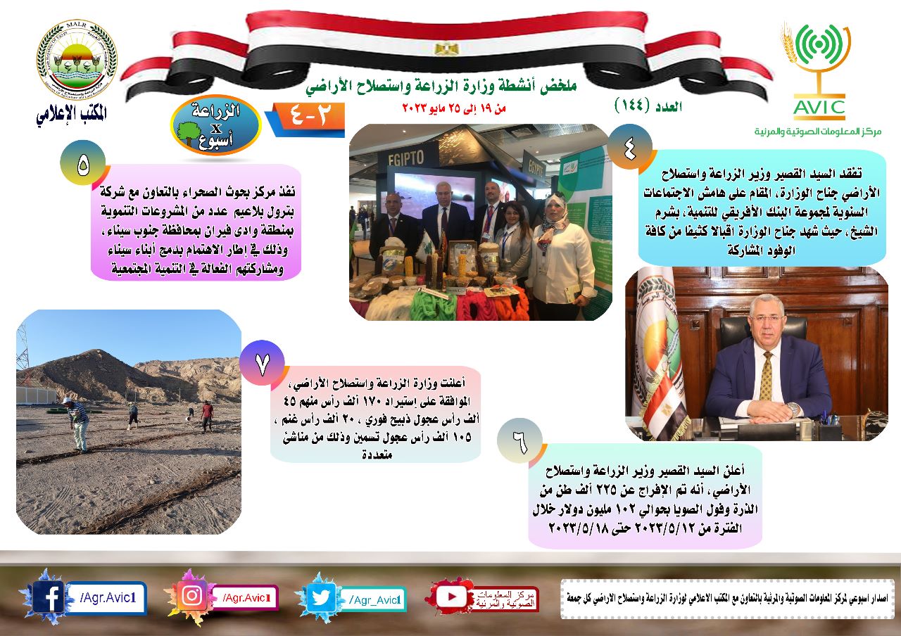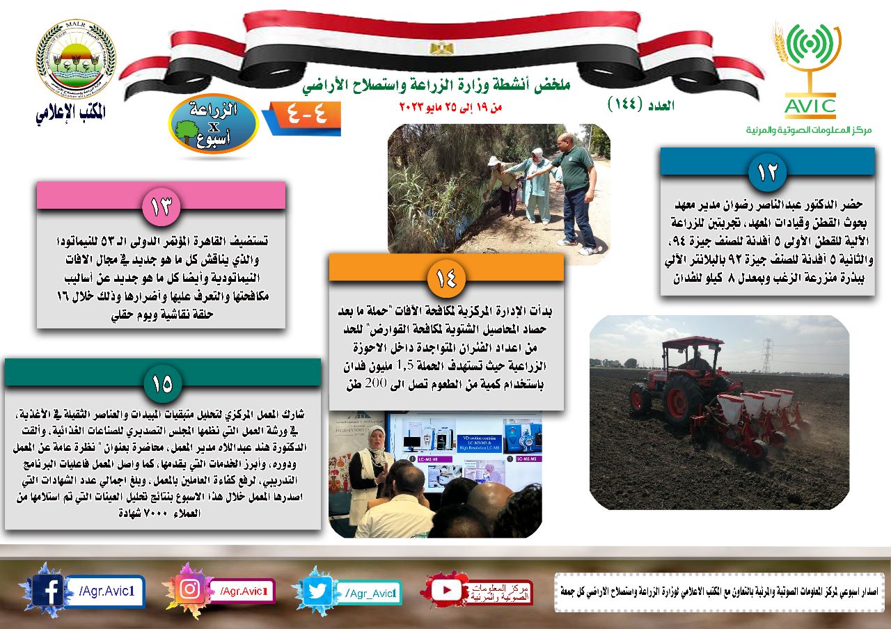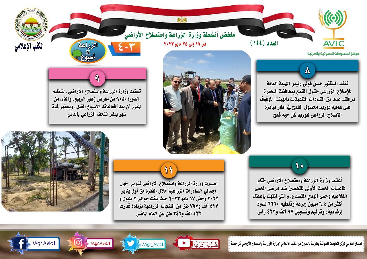 أصدر مركز المعلومات الصوتية والمرئية، التابع لوزارة الزراعة واستصلاح الاراضي، "الإنفوجراف الأسبوعي" في نسخته رقم 144، حول الحصاد الأسبوعي لأهم أنشطة الوزارة، في الفترة من 19 إلى 25 مايو الجاري، وذلك بالتعاون مع المكتب الاعلامي للوزارة، كما أصدر المركز ايضا ملخصا بالفيديو، حول أنشطة الوزارة خلال نفس الفترة.