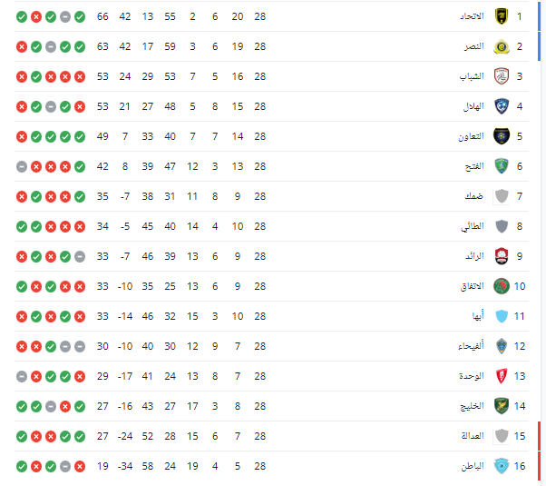 وجاء جدول ترتيب الدوري السعودي كالاتي: