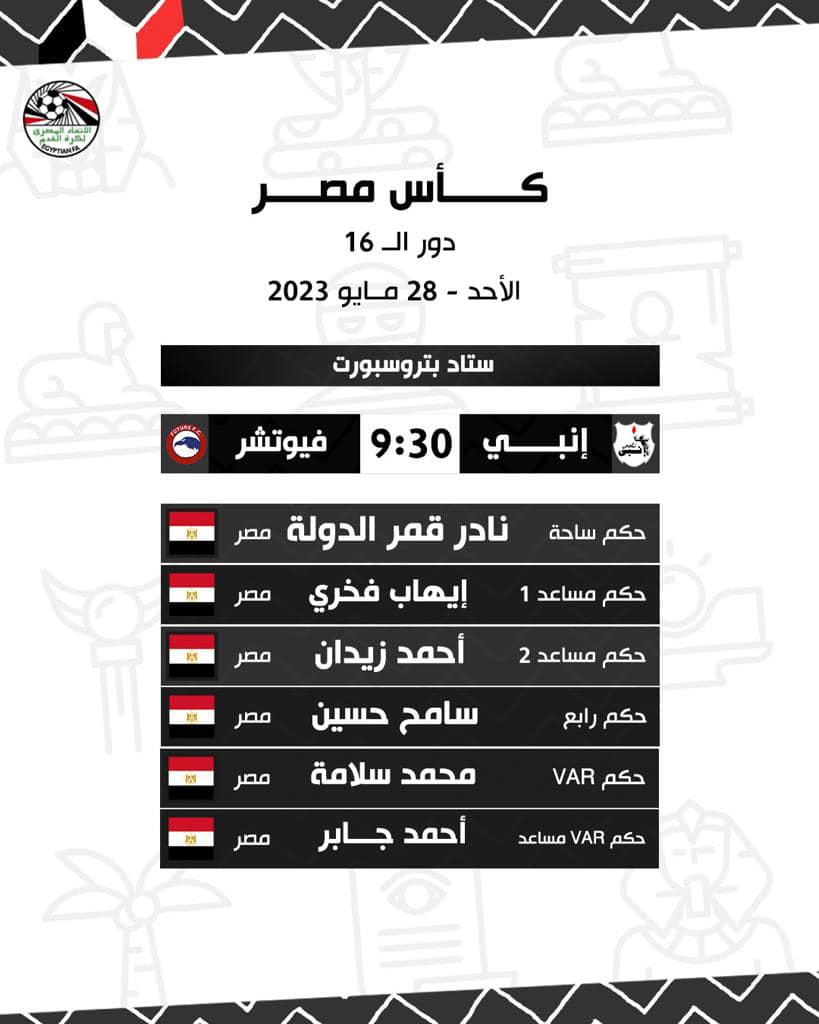 بينما يدير مباراة إنبي وفيوتشر للحكم نادر قمر الدولة ويعاونه إيهاب فخري وأحمد زيدان، وحكما رابعا سامح حسين، بينما يتواجد على تقنية الفار في هذه المباراة كونها مقدمة من دور الـ16 كلا من محمد سلامة حكما للفار وأحمد جابر حكم فار مساعد.