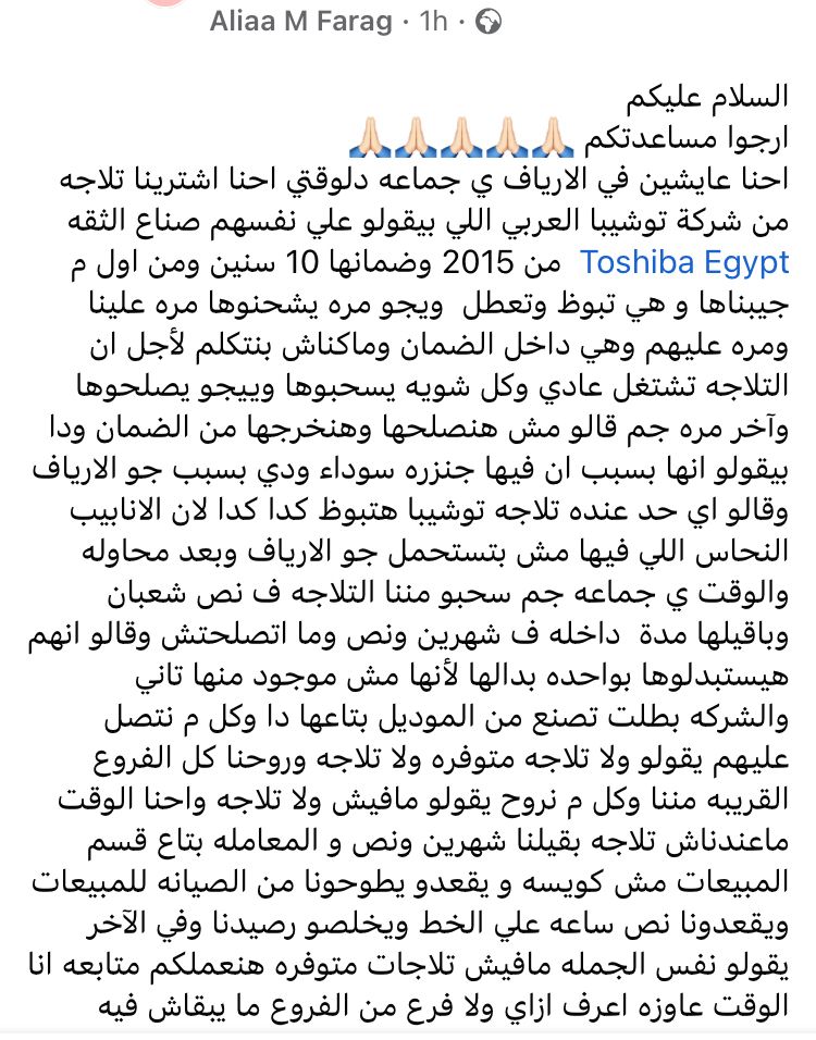 وقالت الأسرة صاحبة المشكلة،"احنا عايشين في الارياف ي جماعه دلوقتي احنا اشترينا تلاجه من شركة توشيبا العربي اللي بيقولو علي نفسهم صناع الثقه Toshiba Egypt من 2015 وضمانها 10 سنين ومن اول م جيبناها و هي تبوظ وتعطل ويجو مره يشحنوها مره علينا ومره عليهم وهي داخل الضمان وماكناش بنتكلم لأجل ان التلاجه تشتغل عادي وكل شويه يسحبوها وييجو يصلحوها وآخر مره جم قالو مش هنصلحها وهنخرجها من الضمان ودا بيقولو انها بسبب ان فيها جنزره سوداء ودي بسبب جو الارياف وقالو اي حد عنده تلاجه توشيبا هتبوظ كدا كدا لان الانابيب النحاس اللي فيها مش بتستحمل جو الارياف وبعد محاوله والوقت ي جماعه جم سحبو مننا التلاجه ف نص شعبان وباقيلها مدة داخله ف شهرين ونص وما اتصلحتش".