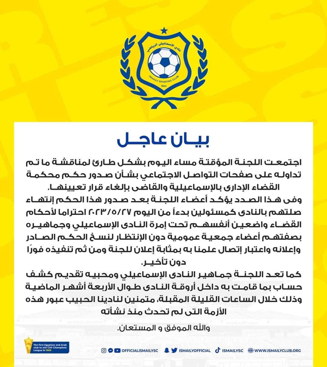 وأضاف البيان: "وفى هذا الصجج يؤكد أعضاء اللجنة المؤقتة بعد صدور هذا الحكم انتهاء صلتهم بالنادى كمسئولين بدءا من اليوم 27 /5 /2023 احتراما لأحكام القضاء واضعين أنفسهم تحت إمرة النادى الإسماعيلى وجماهيره بصفتهم أعضاء جمعية عمومية دون الانتظار لنسخ الحكم الصادر وإعلانه واعتبار اتصال علمنا به بمثابة إعلان للجنة ومن ثم تنفيذه فورا دون تأخير.