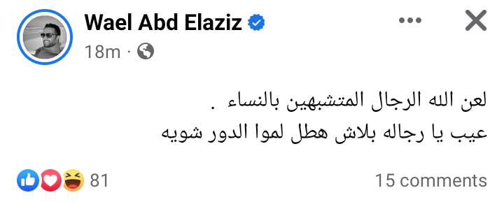 وكتب وائل عبد العزيز عبر حسابه الرسم بموقع التواصل الإجتماعي "فيسبوك": "لعن الله الرجال المتشبهين بالنساء عيب يا رجاله بلاش هطل لموا الدور شوية".