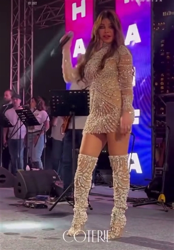 وارتدت هيفاء وهبي فستانا قصيرا ضيقا مطرزا بالكامل، مع حذاء برقبة عالية تصل لأعلى الركبة Over Knees من نفس التطريز، من تصميم الكويتي يوسف الجسمي، من مجموعته للأزياء الراقية 2023.