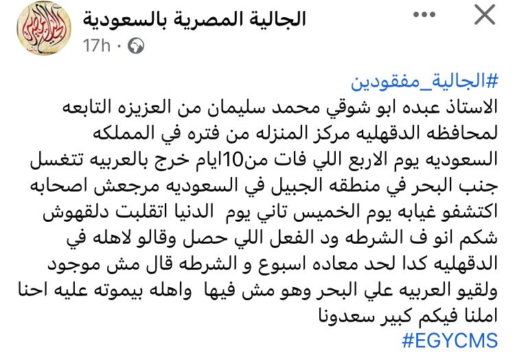 كشفت الجالية المصرية فى السعودية عبر صفحتها الشخصية على موقع التواصل الاجتماعي عن فقدان أحد المصريين من محافظة الدقهلية.