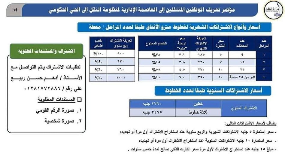 وتابعت أن المرحلة الأولى عدد محطاتها 9 محطات، وتبلغ سعر التذكرة 5 جنية، ويبلغ الاشتراك الشهري 185، والاشتراك الربع سنوي يبلغ 500 جنية، والمرحلة الثانية عدد محطاتها 16 محطة، وتبلغ سعر التذكرة 7 جنيه، ويبلغ الاشتراك الشهري 230 جنيه، والاشتراك الربع سنوي 630 جنيه، والمرحلة الثالثة عدد محطاتها 25 محطة، وتبلغ سعر التذكرة 10 جنيه، ويبلغ الاشتراك الشهري 270 جنيه، والاشتراك الربع سنوي 760 جنيه، والمرحلة الرابعة أكثرمن 25 محطة، وتبلغ سعر التذكرة 10 جنيه، ويبلغ الاشتراك الشهري 360 جنيه، والاشتراك الربع السنوي 1000 جنيه.