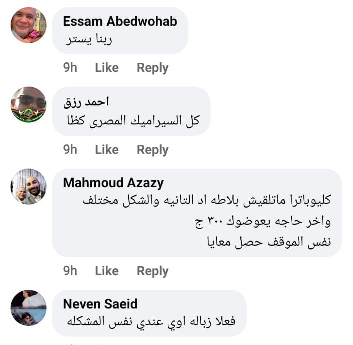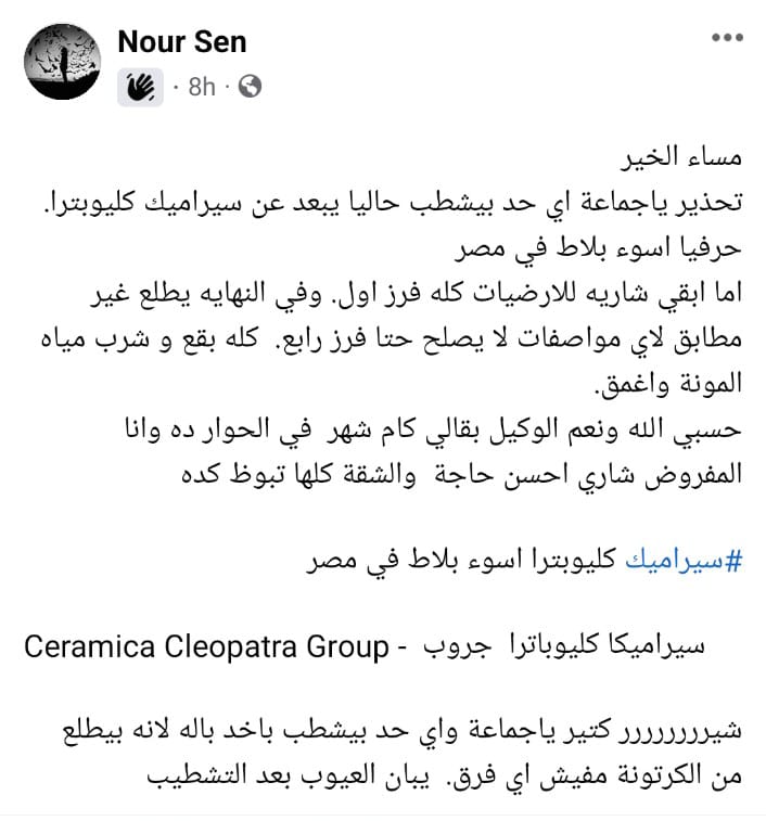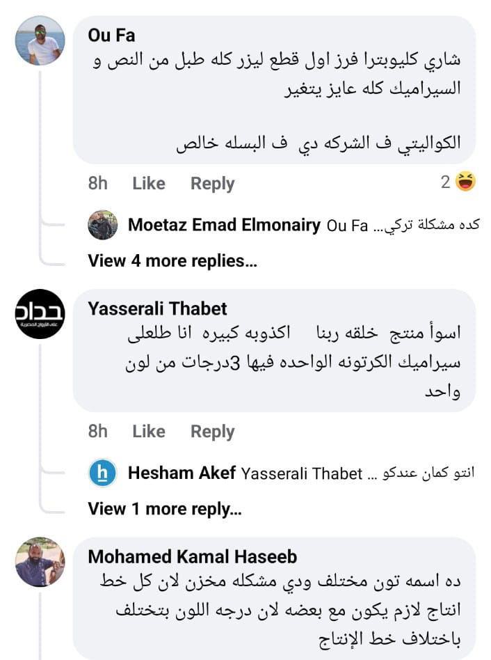 وقال صاحب المشكلة،" مساء الخير تحذير ياجماعة اي حد بيشطب حاليا يبعد عن سيراميك كليوبترا. حرفيا اسوء بلاط في مصر اما ابقي شاريه للارضيات كله فرز اول. وفي النهايه يطلع غير مطابق لاي مواصفات لا يصلح حتا فرز رابع. كله بقع و شرب مياه المونة واغمق".