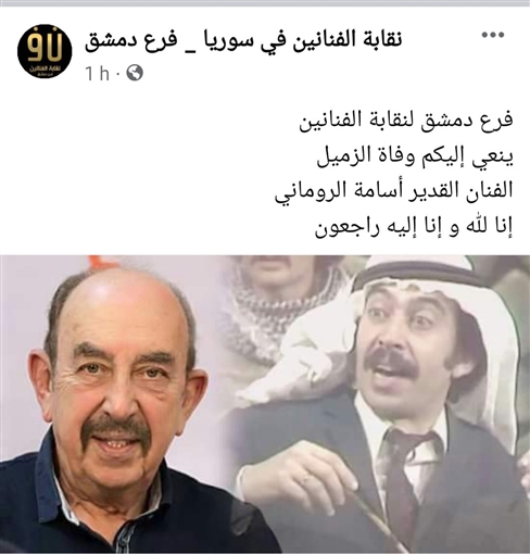 ونعت نقابة الفنانين في سوريا فرع دمشق الفنان الراحل وكتب عبر الصفحة الرسمية للنقابة على “فيسبوك”: فرع دمشق لنقابة الفنانين ينعي إليكم وفاة الزميل الفنان القدير أسامة الروماني إنا لله وإنا إليه راجعون.