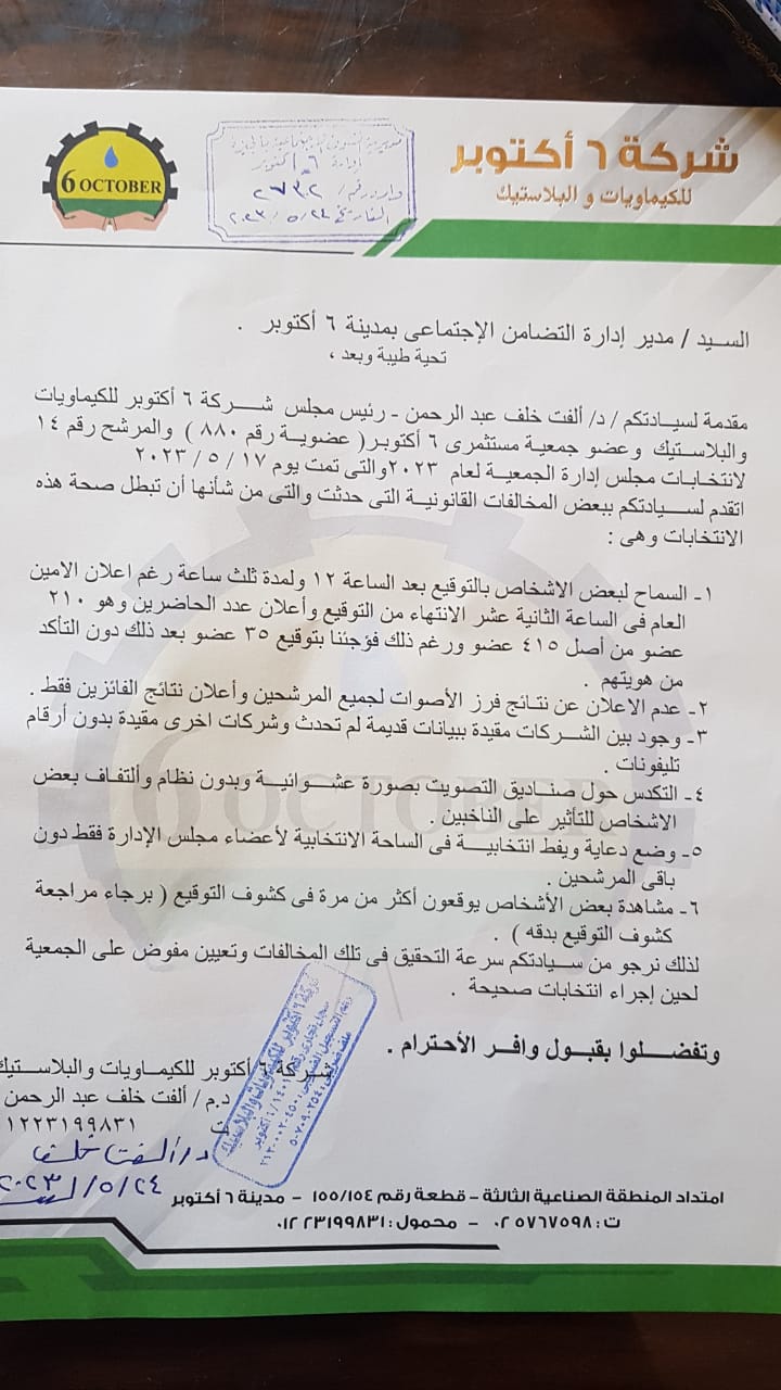 من ناحية آخري تقدمت الدكتورة آلفت خلف عبد الرحمن عضو مستثمري أكتوبر ، لانتخابات مجلس إدارة الجمعية والتي تمت يوم 17/5/2023، لمديرة التضامن الاجتماعي بمدينة 6 أكتوبر، تطالب فيها بتعيين مفوض علي الجمعية لحين أجراءات انتخابات صحيحة وقانونية.، الجدير بالذكر ان مقدمي الشكاوي اكتشفوا تضارب في أرقام النتائج المنشورة بواسطة الأمين العام المهندس عبد المجيد زيد.