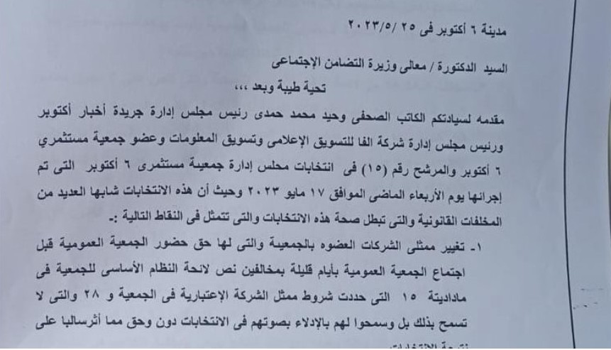 تقدم وحيد حمدي عضو جمعية مستثمري السادس من أكتوبر، عضو لجنة الإشراف علي مشروع 150 فدان، لمديرة التضامن الأجتماعي بمدينة 6 أكتوبر، بالطعن علي الإجراءات الشكلية والإجرائية لانتخابات الجمعية والتي أنتهت منذ أسبوعين، حيث سرد حمدي في المذكرة التي حصل “مصر تايمز" علي نسخة تفيد ببطلان الانتخابات ووجوب إعادتها للأساب التالية التي ذكرها الخطاب الذي يؤكد بأنة تم تغيير ممثلي الشركات أعضاء الجمعية والتي لها حق التصويت من قبل الجمعية العمومية.