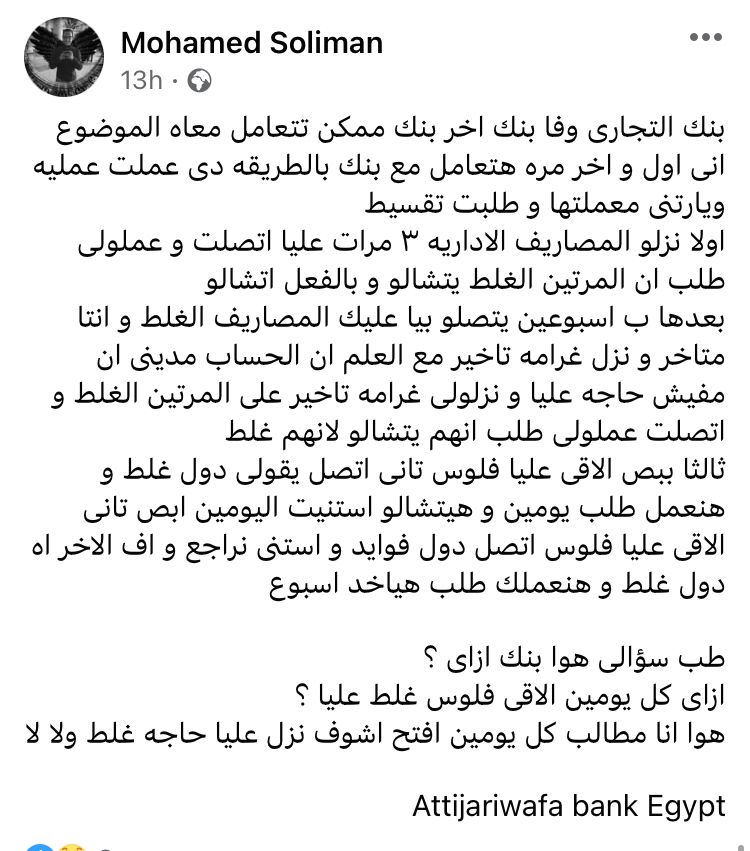 وتابع، "ثالثا ببص الاقى عليا فلوس تانى اتصل يقولى دول غلط و هنعمل طلب يومين و هيتشالو استنيت اليومين ابص تانى الاقى عليا فلوس اتصل دول فوايد و استنى نراجع و اف الاخر اه دول غلط و هنعملك طلب هياخد اسبوع ..طب سؤالى هوا بنك ازاى ؟ازاى كل يومين الاقى فلوس غلط عليا ؟هوا انا مطالب كل يومين افتح اشوف نزل عليا حاجه غلط ولا لا".