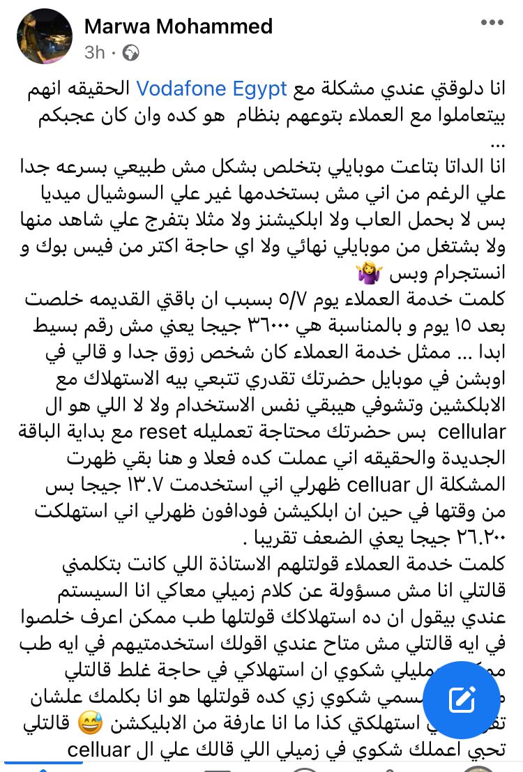 وكشفت مواطنة أخري عن مشكلتها مع شركة فودافون، " انا دلوقتي عندي مشكلة مع Vodafone Egypt الحقيقه انهم بيتعاملوا مع العملاء بتوعهم بنظام هو كده وان كان عجبكم … انا الداتا بتاعت موبايلي بتخلص بشكل مش طبيعي بسرعه جدا علي الرغم من اني مش بستخدمها غير علي السوشيال ميديا بس لا بحمل العاب ولا ابلكيشنز ولا مثلا بتفرج علي شاهد منها ولا بشتغل من موبايلي نهائي ولا اي حاجة اكتر من فيس بوك و انستجرام وبس كلمت خدمة العملاء يوم 5/7 بسبب ان باقتي القديمه خلصت بعد 15 يوم و بالمناسبة هي 36000 جيجا يعني مش رقم بسيط ابدا … ممثل خدمة العملاء كان شخص زوق جدا و قالي في اوبشن في موبايل حضرتك تقدري تتبعي بيه الاستهلاك مع الابلكشين وتشوفي هيبقي نفس الاستخدام ولا لا اللي هو ال cellular بس حضرتك محتاجة تعمليله reset مع بداية الباقة الجديدة والحقيقه اني عملت كده فعلا و هنا بقي ظهرت المشكلة ال celluar ظهرلي اني استخدمت ١٣.٧ جيجا بس من وقتها في حين ان ابلكيشن فودافون ظهرلي اني استهلكت ٢٦.٢٠٠ جيجا يعني الضعف تقريبا "
