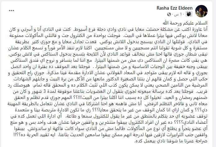 وقالت" المهم جوزي قدم تظلم و اتحقق معاه تاني و فالاخر التظلم اترفض، أنا مش فاهمه هو احنا اشتركنا في النادي عشان نتعامل بالطريقة المهينة دي؟؟؟ و كمان ازاي انا كمان اتوقف من غير ما يتحقق معايا؟؟؟ زي ما تكون الادارة متربصة بينا و متعمدة توقف عضويه اي حد يتكلم بالمنطق من غير ما يقول للكنترول سمعا و طاعة، أي ادارة اللي تعمل كده في أعضاء النادي؟؟؟؟ ده غير ان افراد الكنترول بيبقوا منتشرين و واقفين حرفيا عشان هدف واحد بس و هو منع أي عضو يتجرأ و يطلع أي نوع من المأكولات طالما مش من النادي سواء كانت فاكهة او ساندوتش. بيبقوا واقفين جنب الترابيزات لازقين فيها لدرجة انهم ممكن يبقوا سامعين الحديث بتاعنا. ايه تقييد الحرية ده؟؟!! صراحة عمرنا ما شوفنا نادي بيعمل كده".