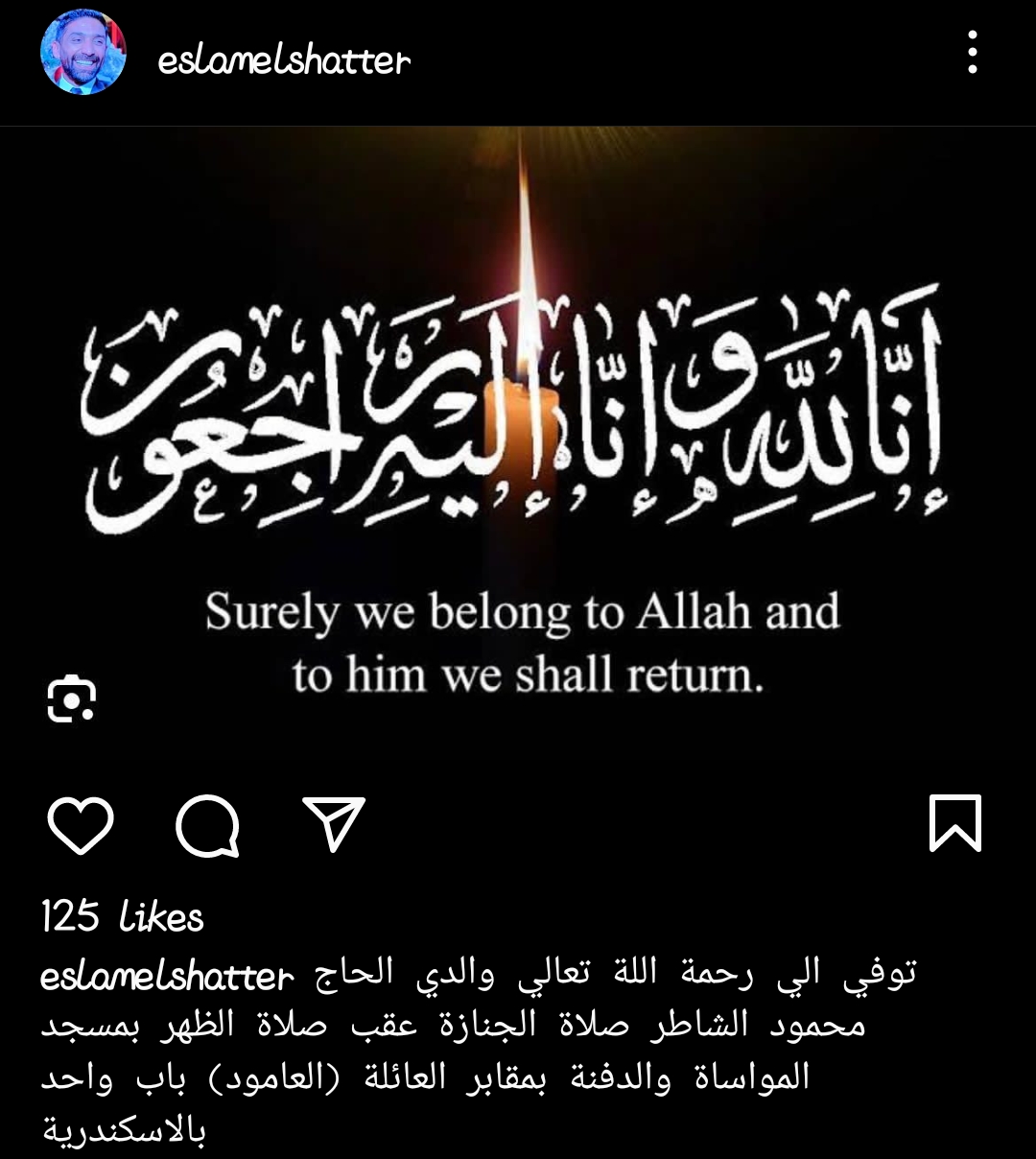 توفي صباح اليوم الأربعاء، والد إسلام الشاطرنجم النادى الأهلي السابق، ومن المقرر ان تقام صلاة الجنازة عقب صلاة الظهر بمسجد المواساة، وتتم الدفنة بمقابر العائلة (العامود) باب واحد بالإسكندرية.