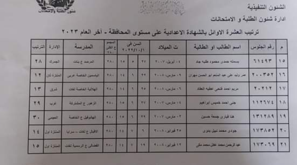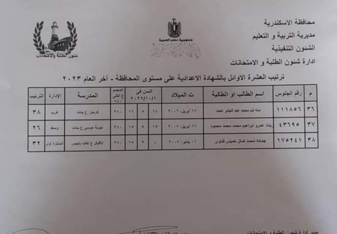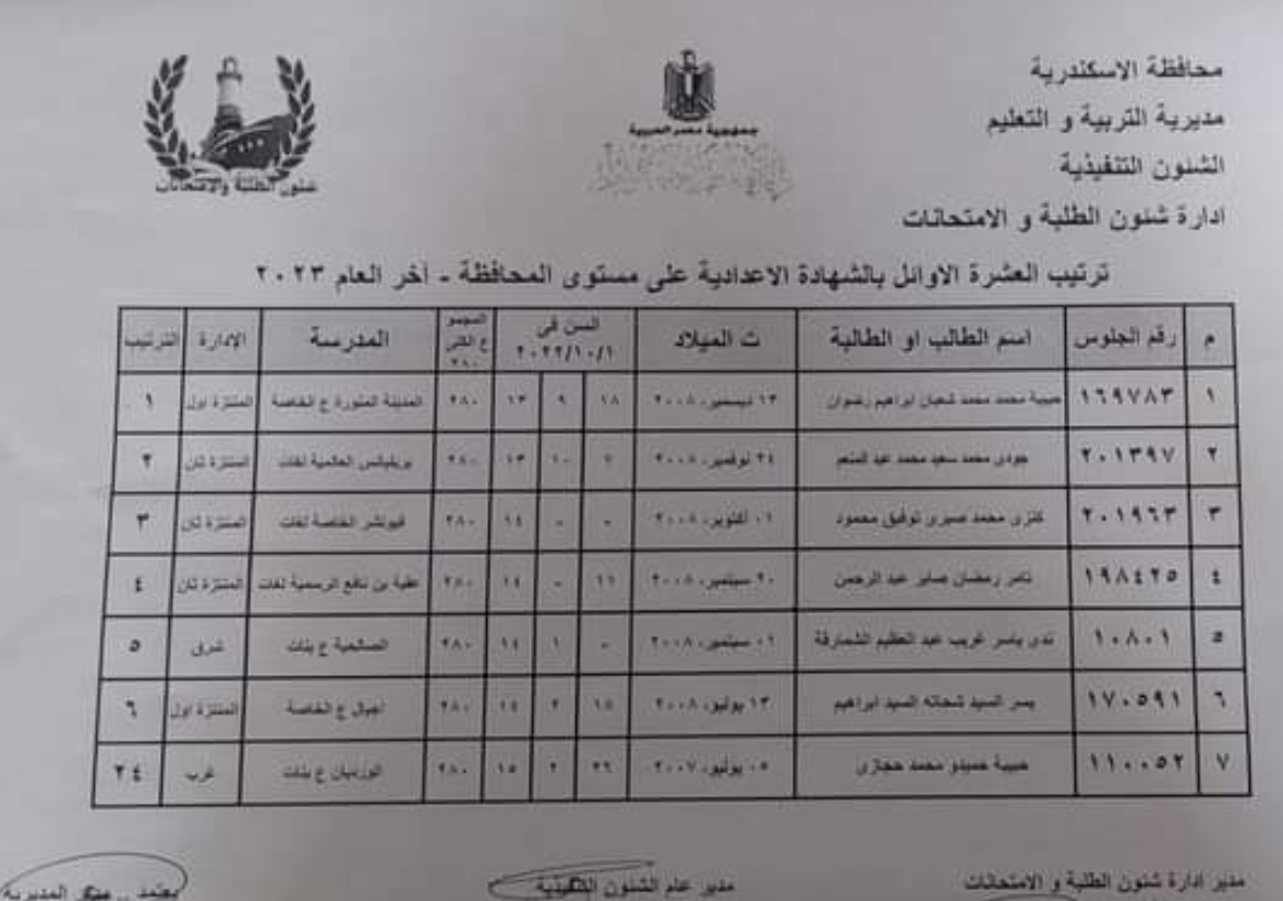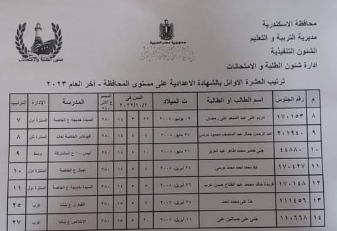 ننشر أسماء أوائل الشهادة الإعدادية بمحافظة الإسكندرية