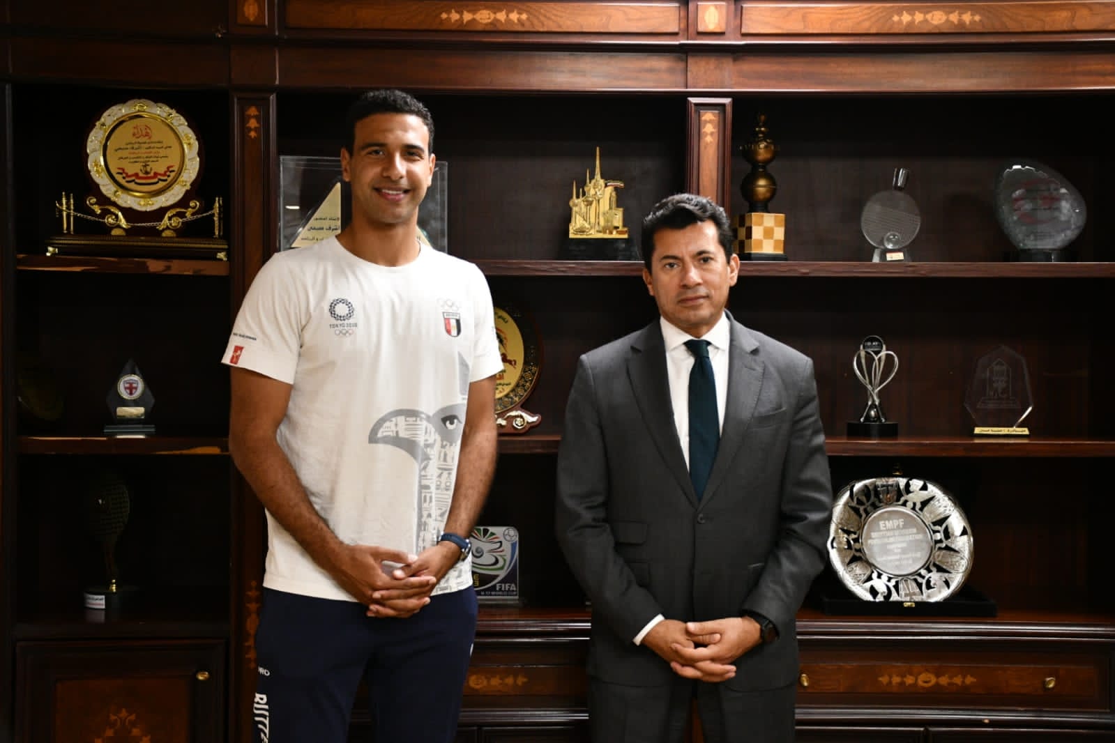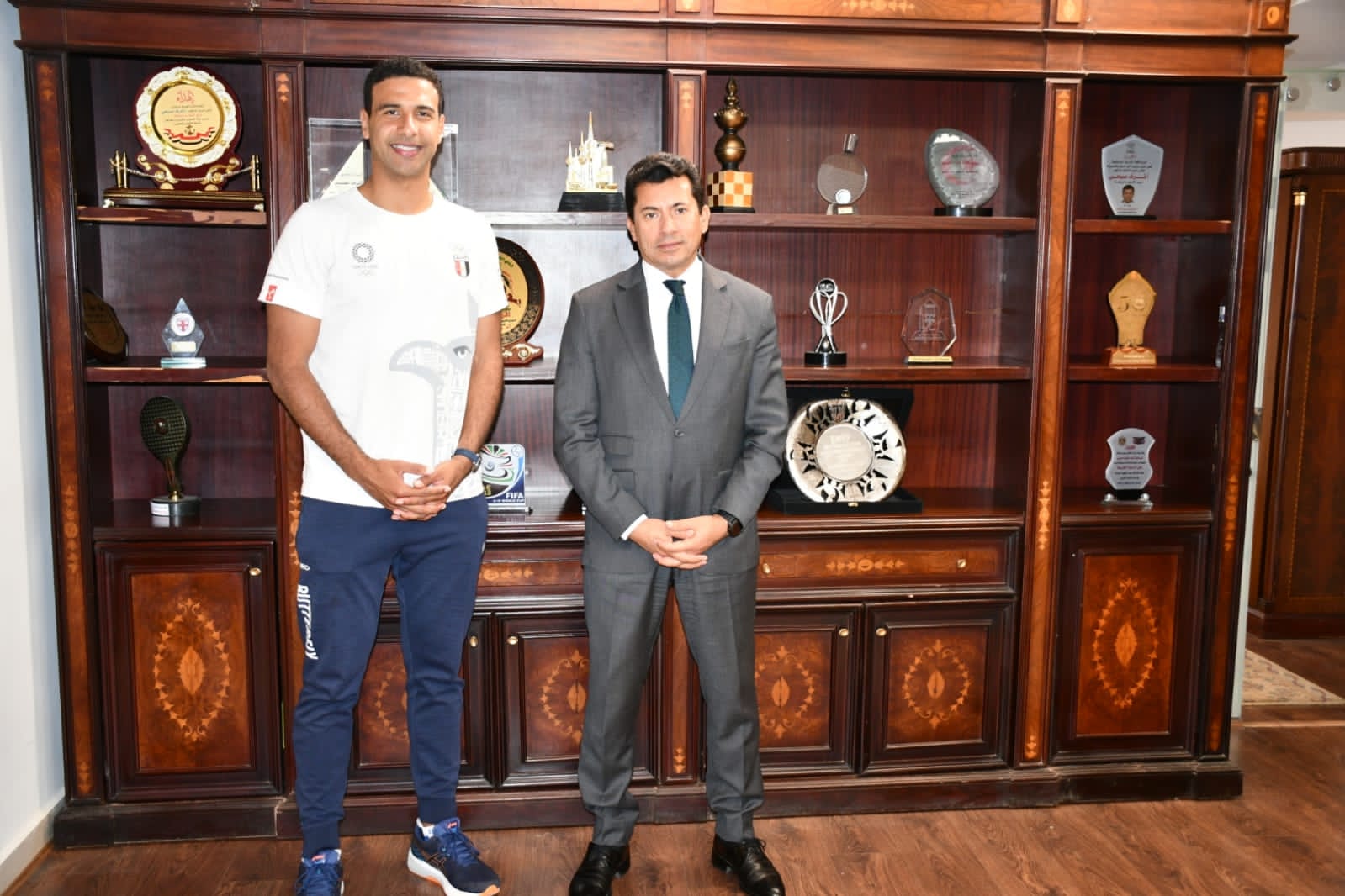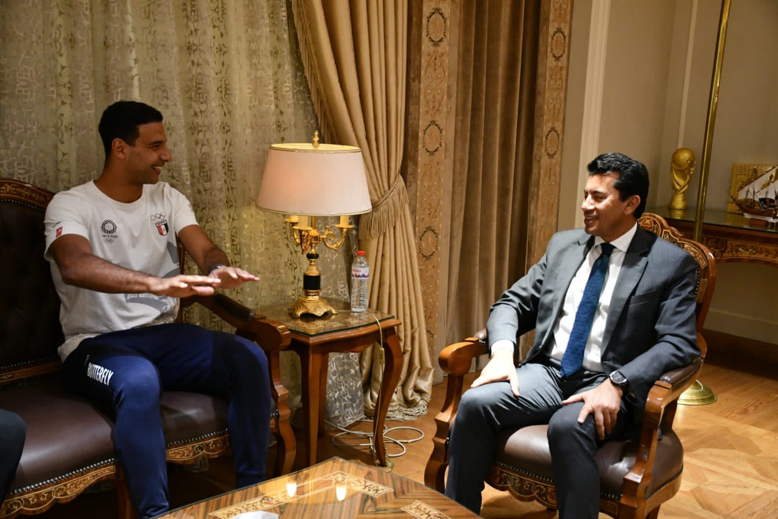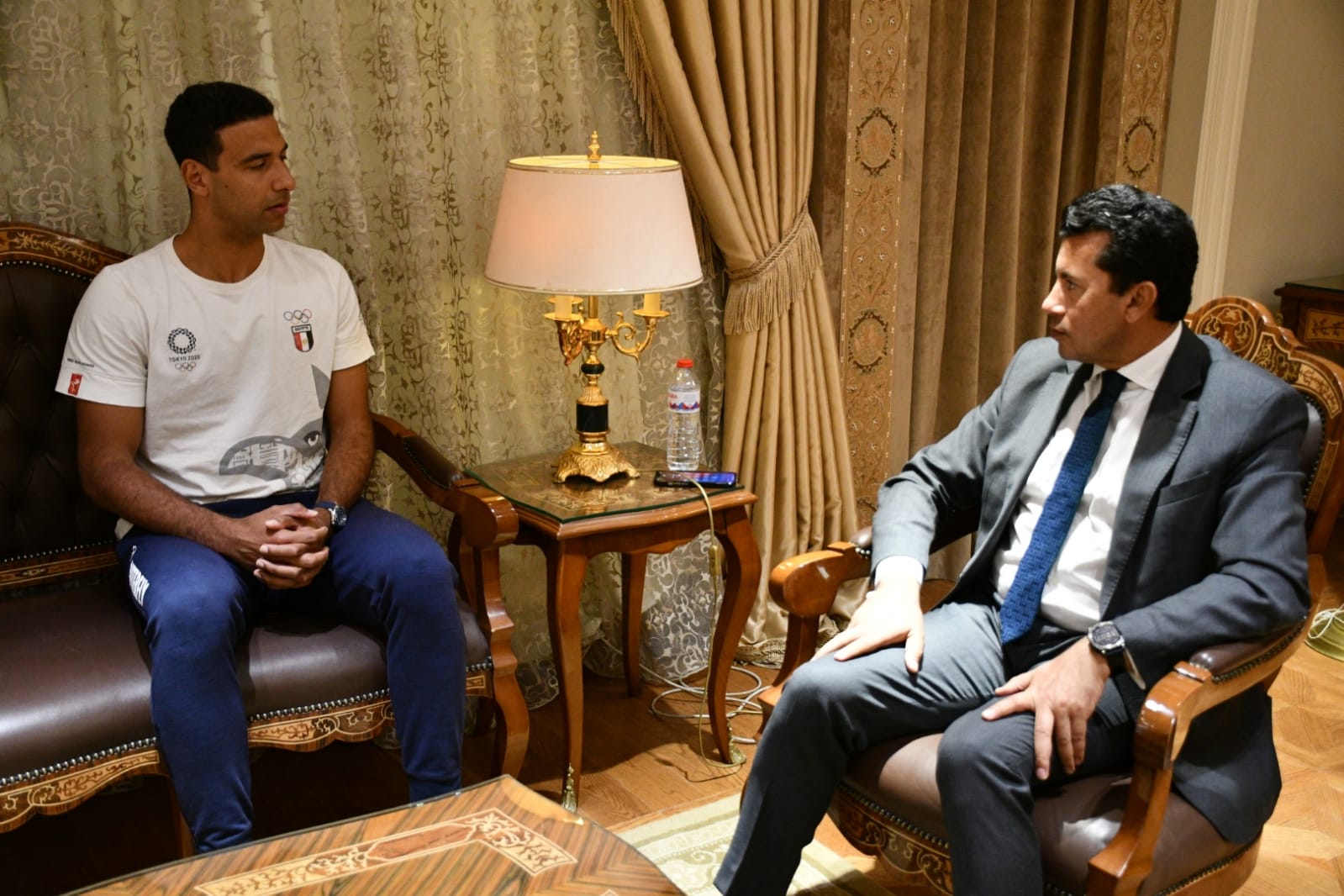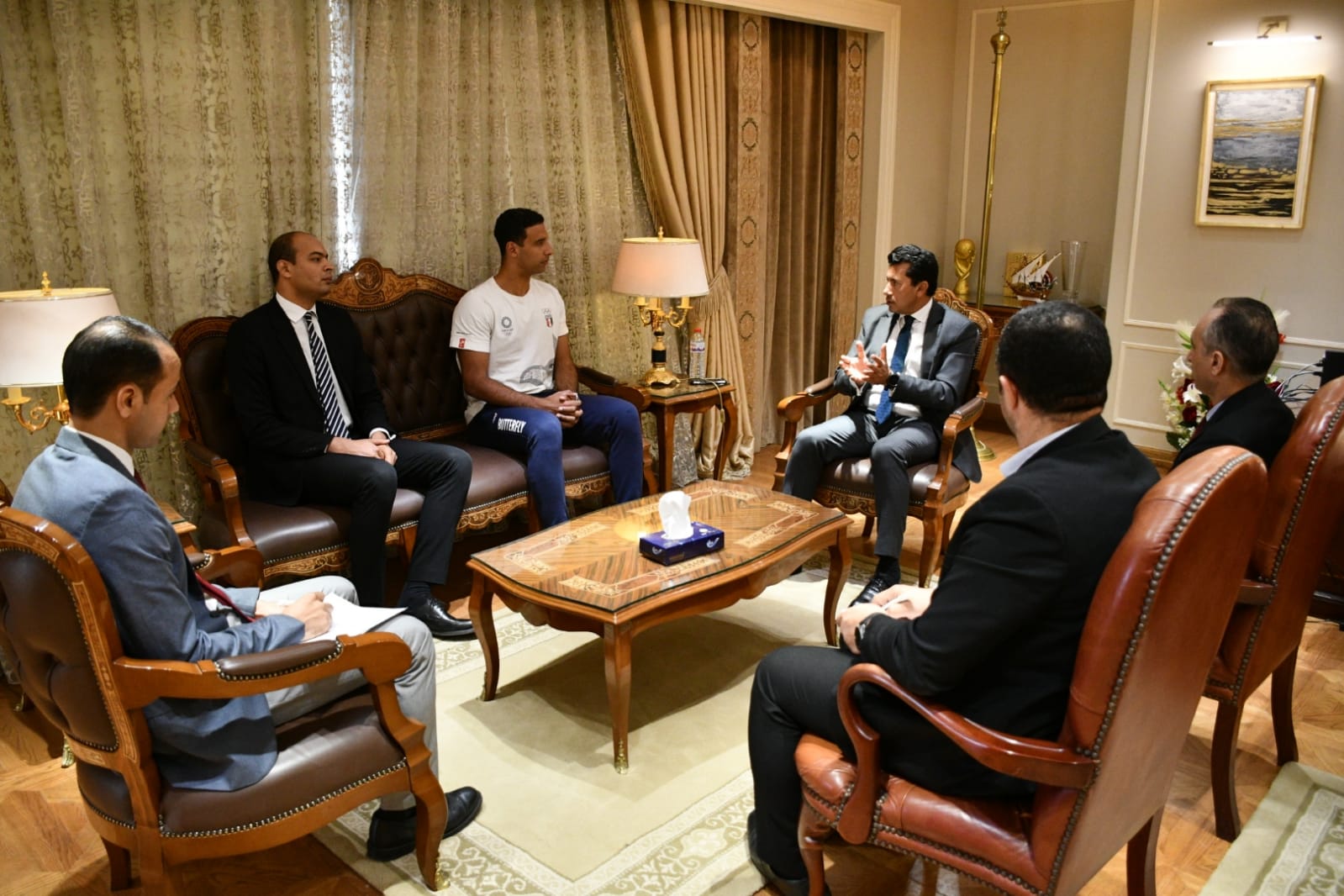وزير الشباب والرياضة يلتقي لاعب منتخب مصر لتنس الطاولة عمر عصر