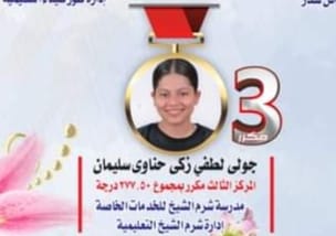 جولي لطفى ناوي سليمان المركز الثالث مكرر بمجموع 277.50 درجة مدرسة شرم الشيخ للخدمات الخاصة ادارة شرم الشيخ التعليميه.