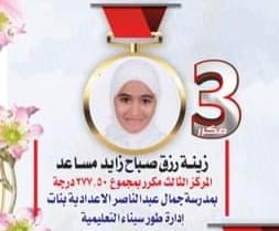 زينه رزق صباح زايد مساعد المركز الثالث مكرر بمجموع 277.50درجه بمدرسة جمال عبدالناصر الاعدادية بنات ادارة طور سيناء التعليمية