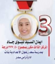 ايمان السيد نبوى جاد المركز الثالث مكرر مجموع 277.50 درجة بمدرسة سعد زغلول الاعدادية بنات ادارة رأس سدر التعليمية