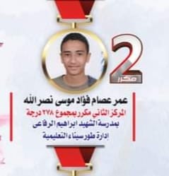 عمر حماد فؤاد موسى نصر الله المركز الثاني مكرر بمجموع 278 درجة بمدرسة الشهيد ابراهيم الرفاعي إدارة طور سيناء التعليمية