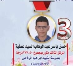 حسن ياسر عبد الوهاب السيد عطيه المركز الثالث مكرر بمجموع 277.50 درجة مدرسه الشهيد ابراهيم رفاعي إدارة طور سيناء التعليمية