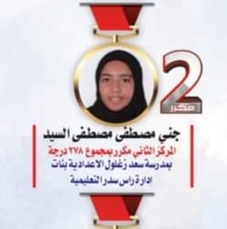 جني مصطفى مصطفى السيد المركز الثاني مكرر بمجموع 278 درجة مدرسة سعد زغلول الاعدادية بنات ادارة رأس سدر التعليمية