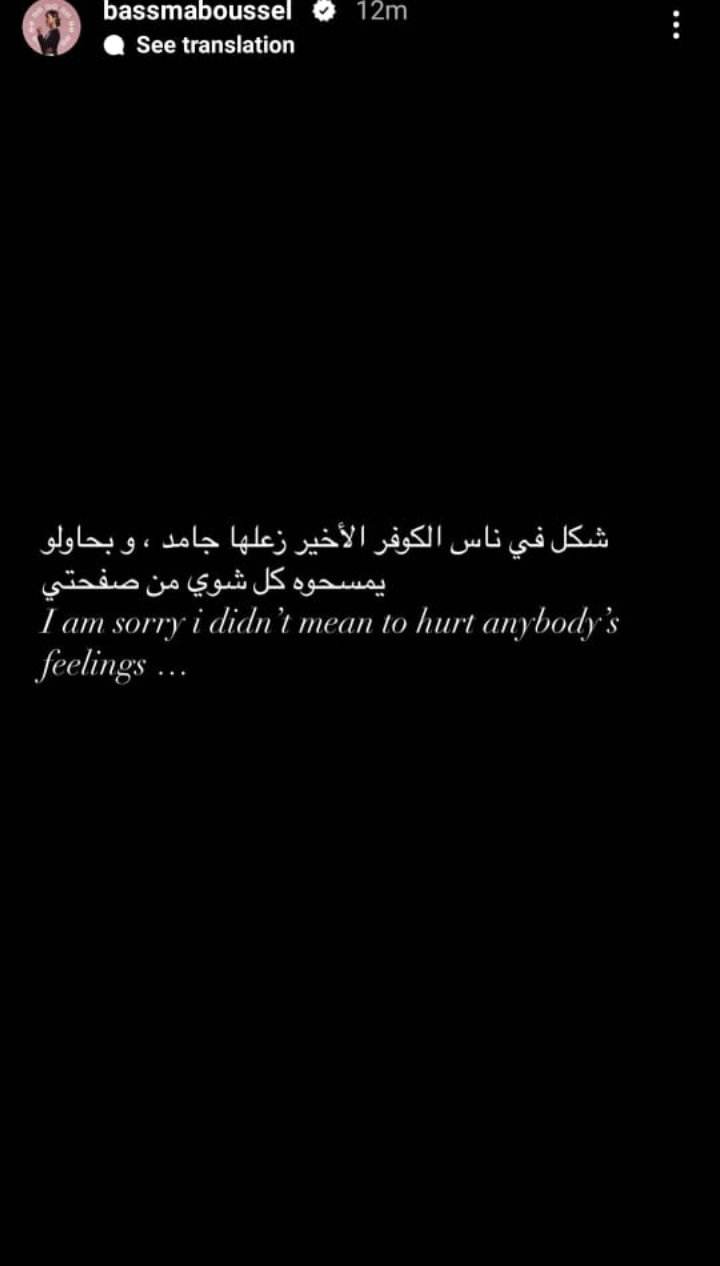 وكتبت بسمة بوسيل عبر حسابها الرسمي بموقع تبادل الصور والفيديوهات:"إنستجرام" قائلة:" شكل في ناس الكوفر الاخير زعلها جامد، وبيحالوا يمسحوه من على صفحتي كل شوية، عذرا انا لم أقصد أن أذي شعور أي شخص".