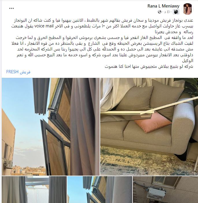 وتابعت عن بوتاجاز فريش،" دمر الشقة من الدخان و الريحة و الدخان كان في كل حته و كان ممكن يخنقنا لو كنا اتأخرنا ثواني بس!!!!!كمان حرق الشفاط اللي فوقه من النار و فيش الكهربا اللي فوق البوتجاز و كان ممكن يموتنا و يحرق الشقة كلها!!!!! دا يرضي مين بجدد المهم كلمنا فريش و بعته مهندس و قال ان دا حصل بسبب الخطأ بتاع الفني اللي جه صلحه من فترة و بقالنا 3 ايام بنتواصل معاهم و هما عارفين ان الغلط منهم لان مفيش حاجة ممكن تخللي البوتجاز ينفجر و يولع كدا و دا كلامهم كمان".