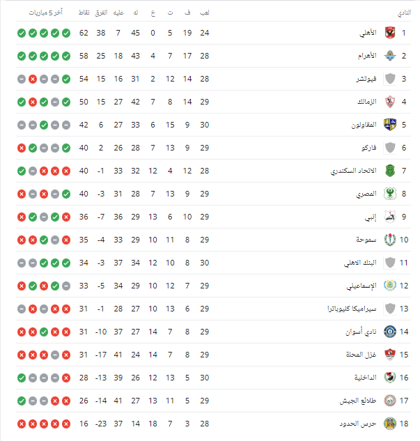 ويتصدر النادي الأهلي جدول ترتيب الدوري المصري برصيد 62 نقطة، وجاء الترتيب كالاتي: