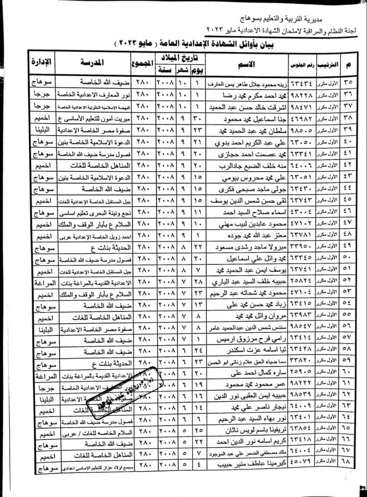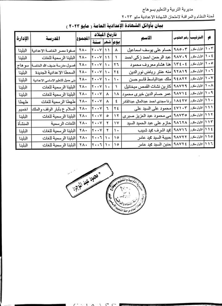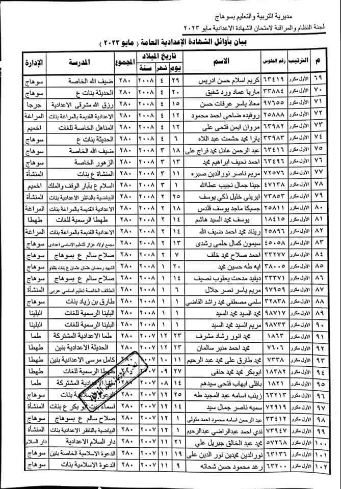 أسماء أوائل الشهادة الإعدادية بسوهاج