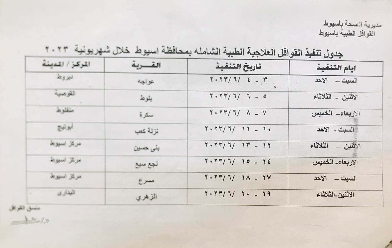 وأضاف المحافظ أن القوافل الطبية لشهر يونيو تبدأ عملها من يوم 3 إلى 20 يونيو 2023 ويتم تنفيذها بواقع يومين بكل قرية حيث تبدأ يومي السبت والأحد 3 و4 يونيو بقرية عواجه بمركز ديروط تنتقل بعدها لقرية بلوط بمركز القوصية يومي الاثنين والثلاثاء 5 و6 يونيو بعدها توجه لقرية سكرة بمركز منفلوط يومي الأربعاء والخميس 7و8 يونيو ثم قرية نزلة كعب بمركز أبوتيح يومي السبت والأحد 10 و11 يونيو بعدها تنتقل قرية بني حسين بمركز أسيوط يومي الاثنين والثلاثاء يومي 12 و13 يونيو ثم قرية نجع سبع بذات المركز يومي الأربعاء والخميس 14 و15 يونيو ثم قرية مسرع بنفس المركز يومي السبت والأحد 17 و18 يونيو وتنهي القوافل أعمالها يومي الاثنين والثلاثاء 19 و20 يونيو بقرية الزهري بمركز البداري.