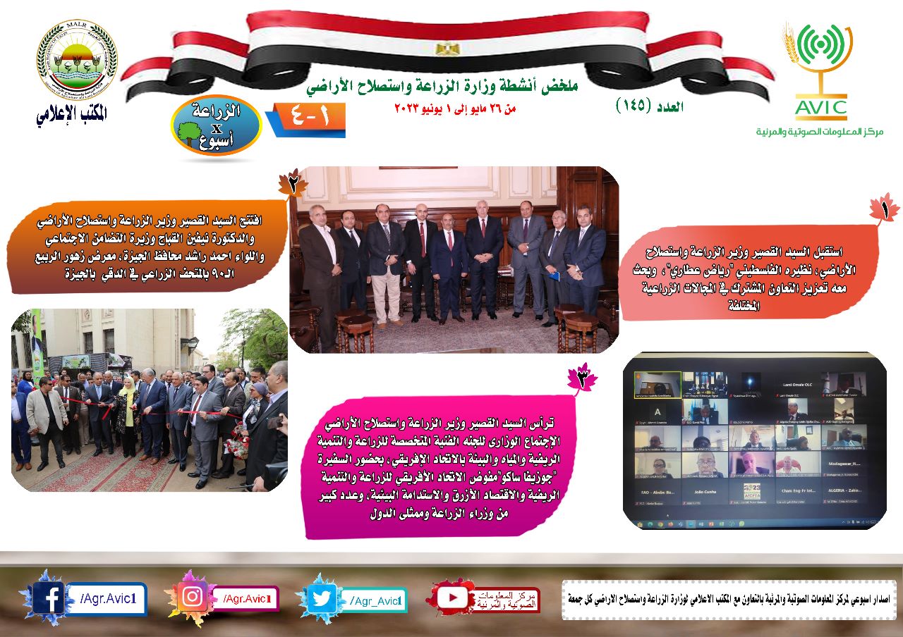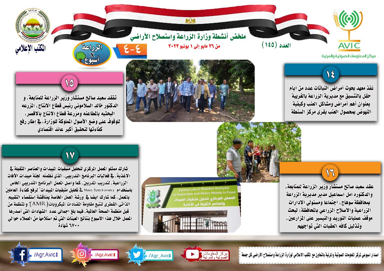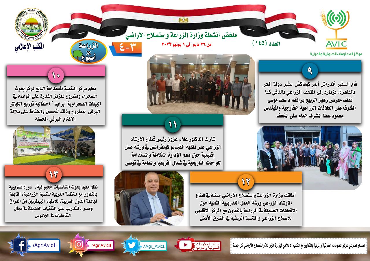 أصدر مركز المعلومات الصوتية والمرئية، التابع لوزارة الزراعة واستصلاح الاراضي، "الانفوجراف الاسبوعي" في نسخته رقم 145، حول الحصاد الأسبوعي لأهم أنشطة الوزارة، خلال الأسبوع الماضي في الفترة من 26 مايو وحتى 1 يونيو الجاري، وذلك بالتعاون مع المكتب الإعلامي للوزارة، كما أصدر المركز ايضا ملخصا بالفيديو، حول انشطة الوزارة خلال نفس الفترة.